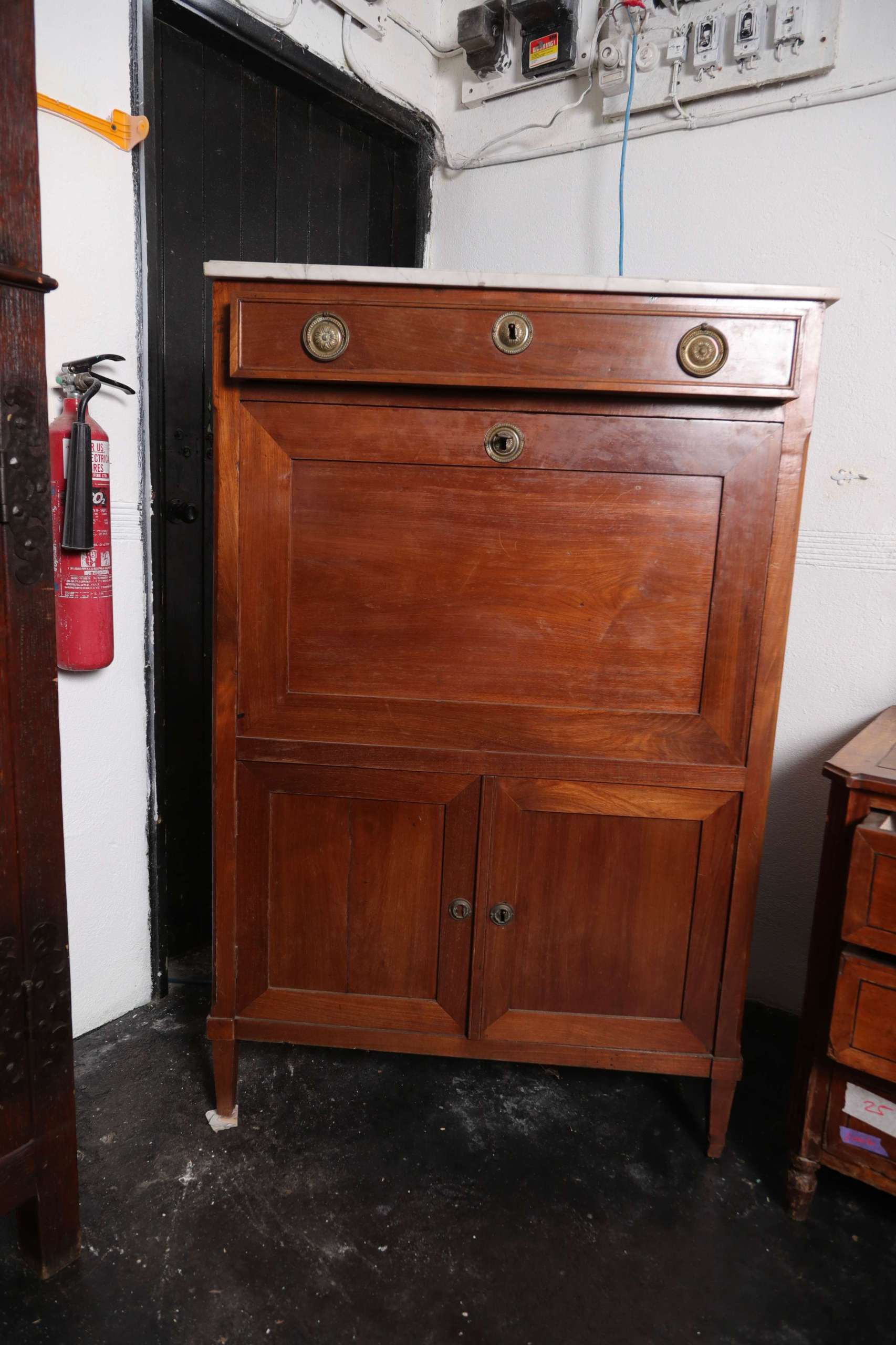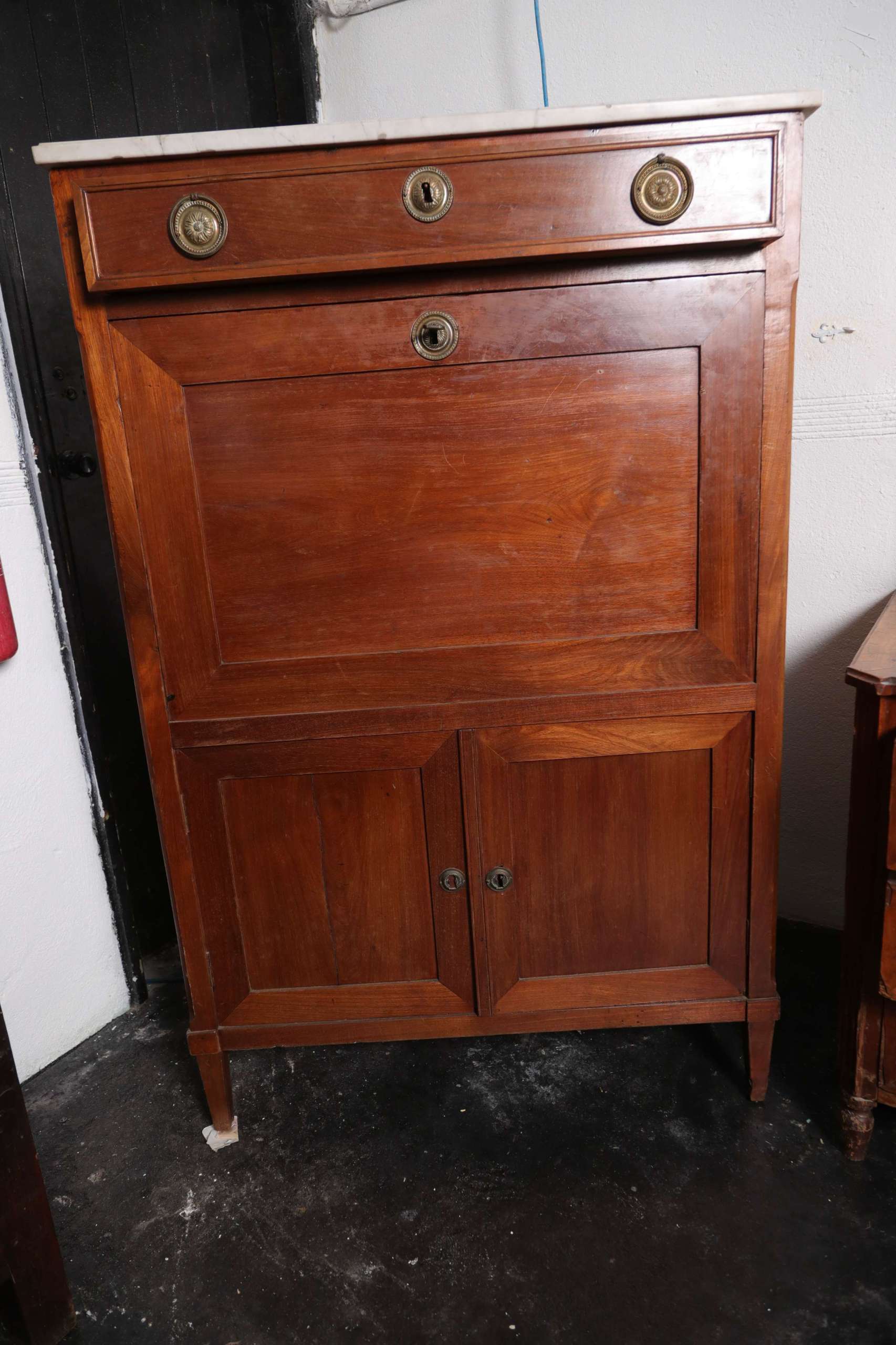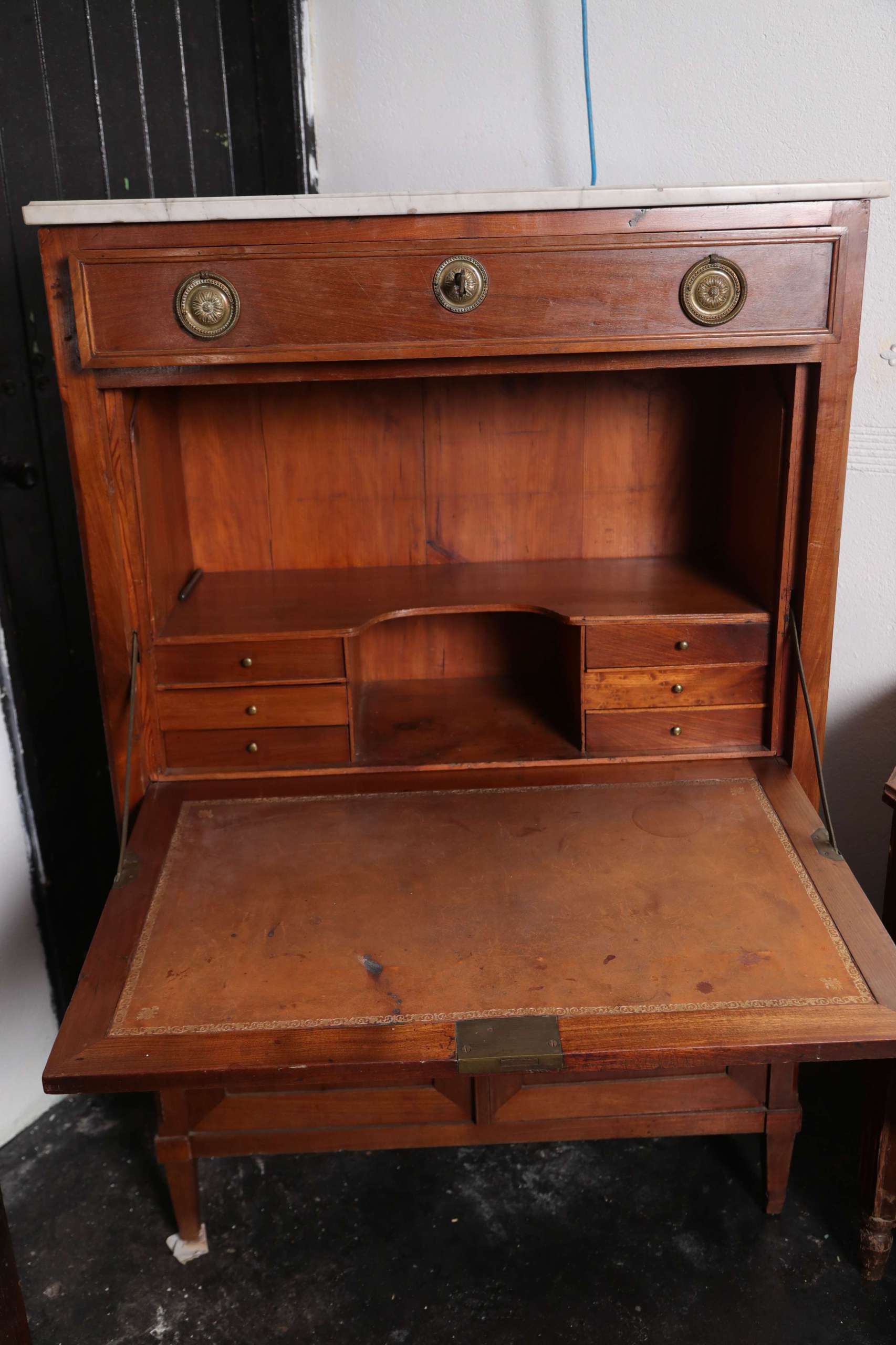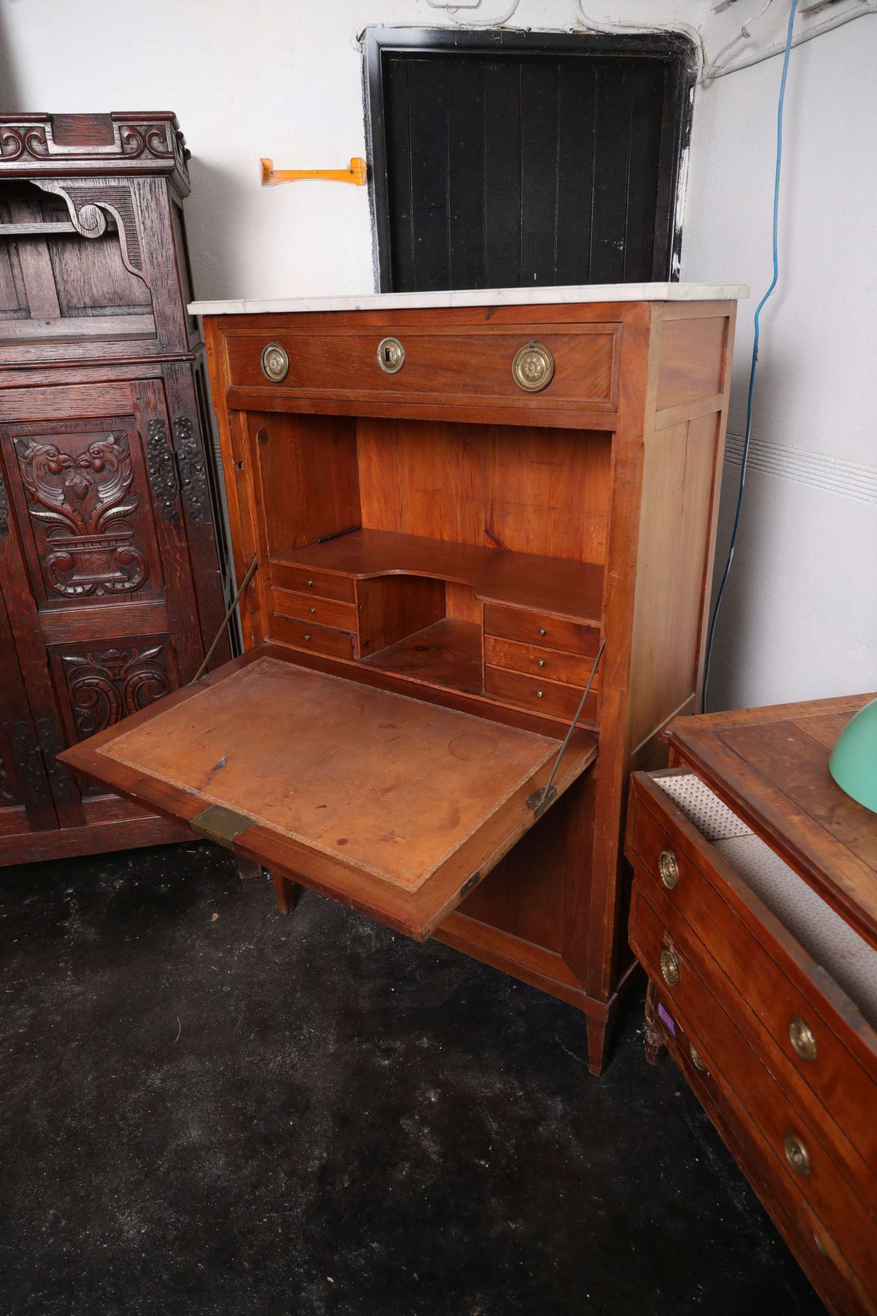Home / French Antiques / Antique Tables, Desks and Vanity / French Empire Marble-Top Secrétaire Desk French Empire Marble-Top Secrétaire Desk Elegant 19th-century French secrétaire with a white marble top and classic Empire brass accents. Offers a drop-front leather writing surface and multiple internal drawers for refined storage. Categories: Antique Tables, Desks and Vanity, French Antiques Product ID: 1335