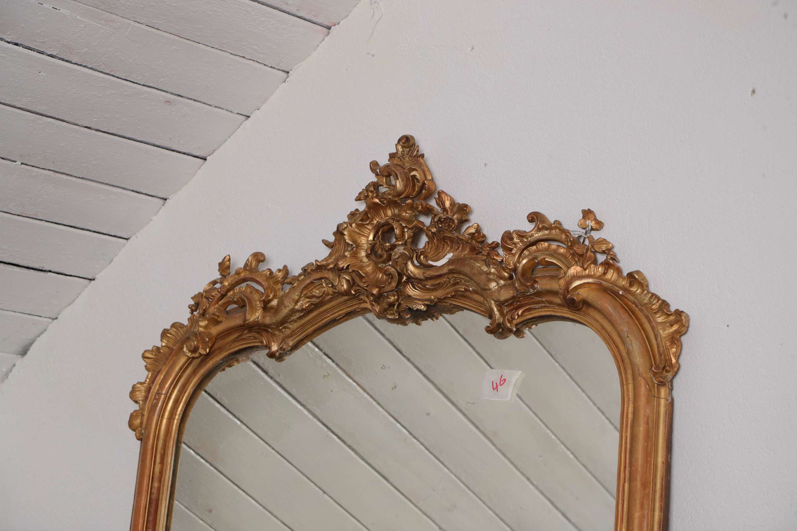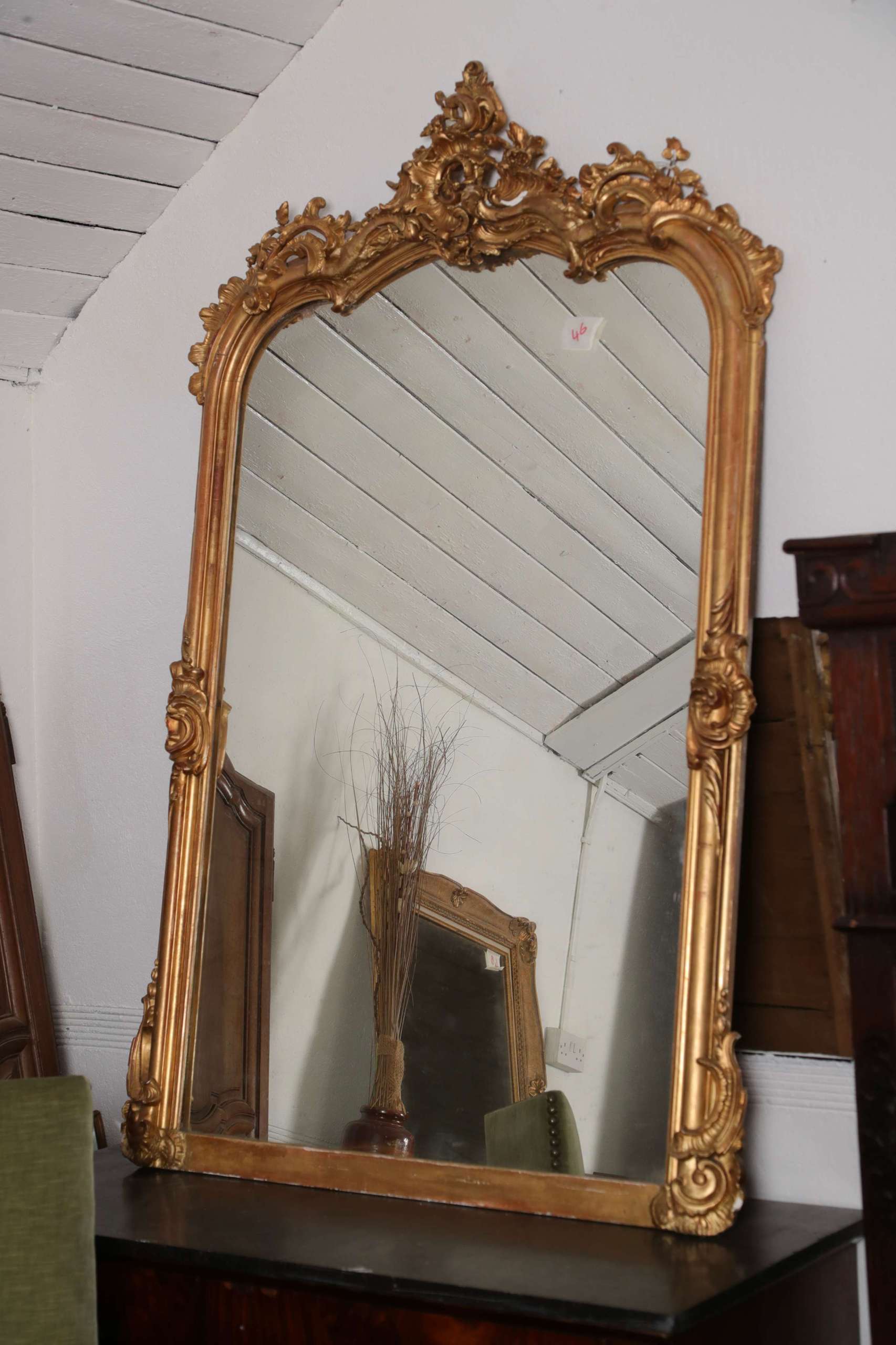 Ornate crest with floral and scroll motifs, typical of Rococo influences. Gilded wood frame, with gesso ornamentation.