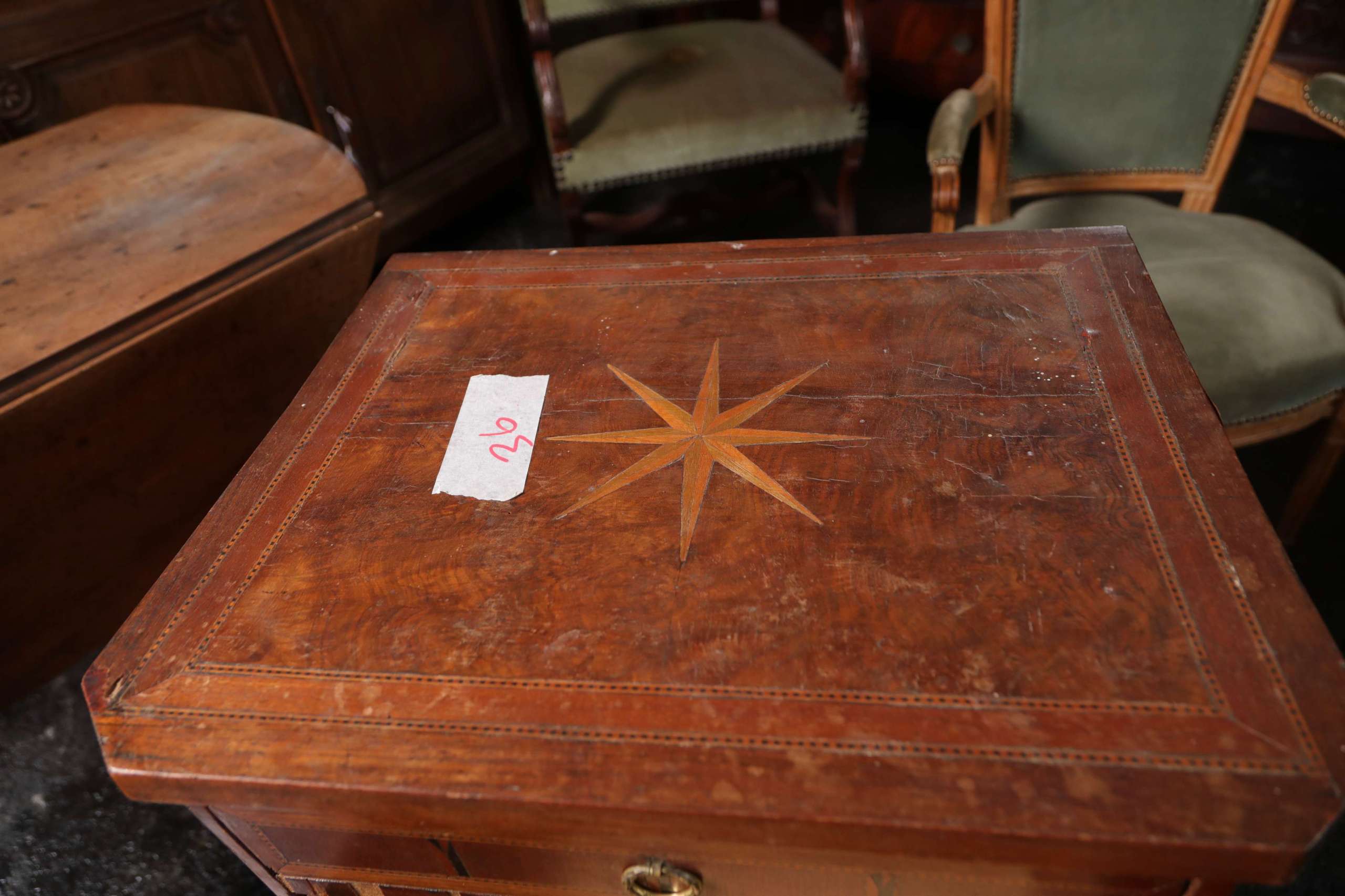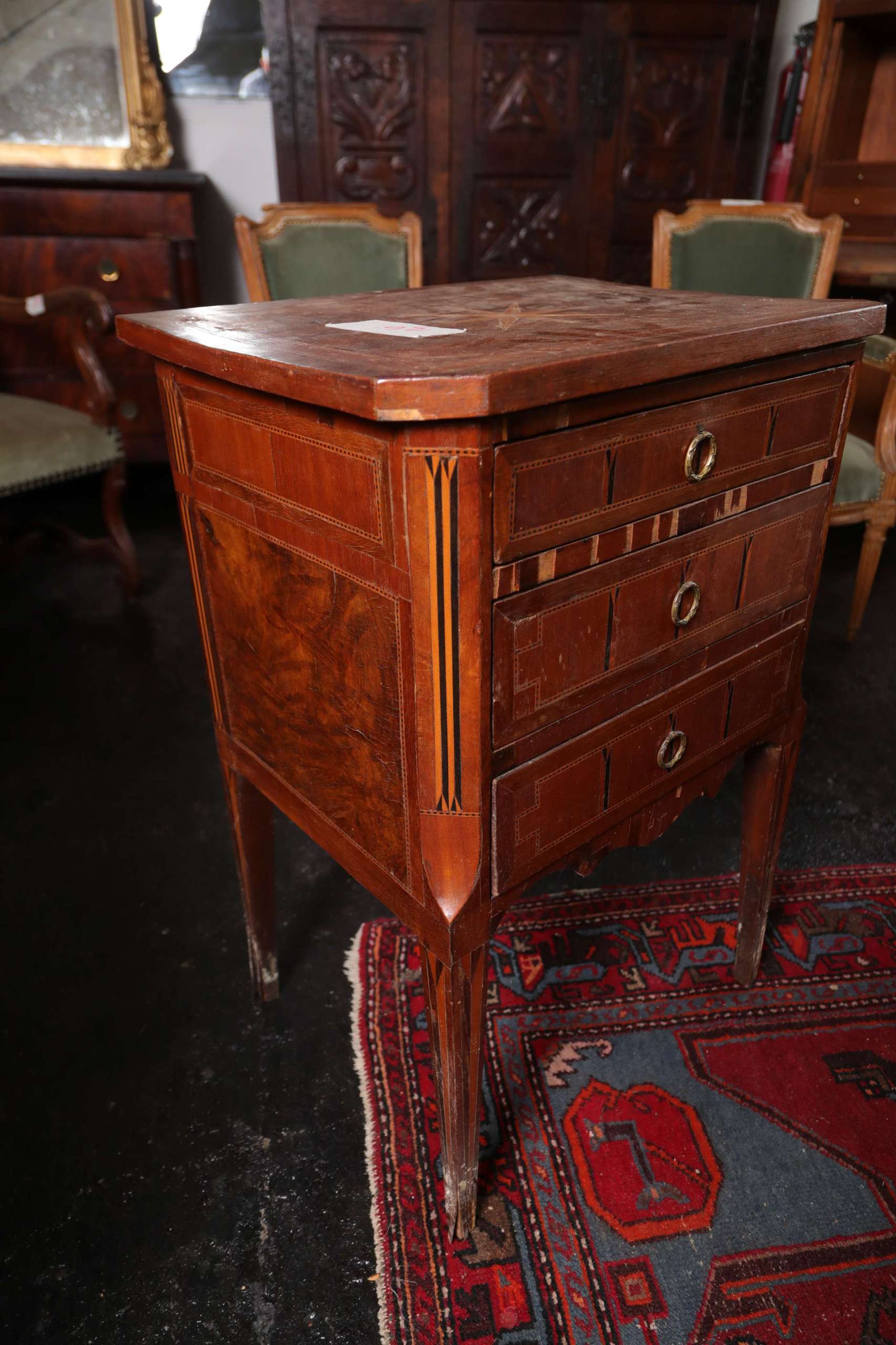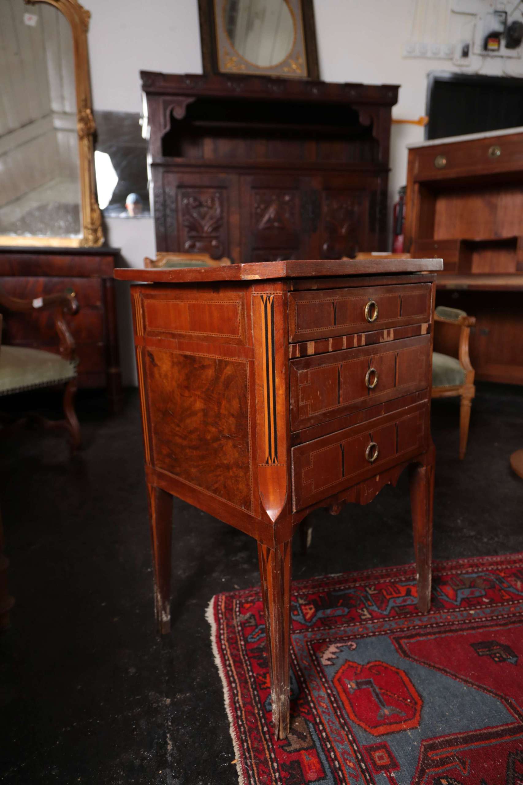 Home / French Antiques / Antique Cabinets & Sideboards / Louis XVI bedside cabinet Louis XVI bedside cabinet Charming Louis XVI-style marquetry side cabinet with intricate geometric inlay and starburst top design. Features three drawers, fluted legs, and elegant brass ring pulls—ideal as a bedside or accent piece. Categories: Antique Cabinets & Sideboards, French Antiques Product ID: 1314