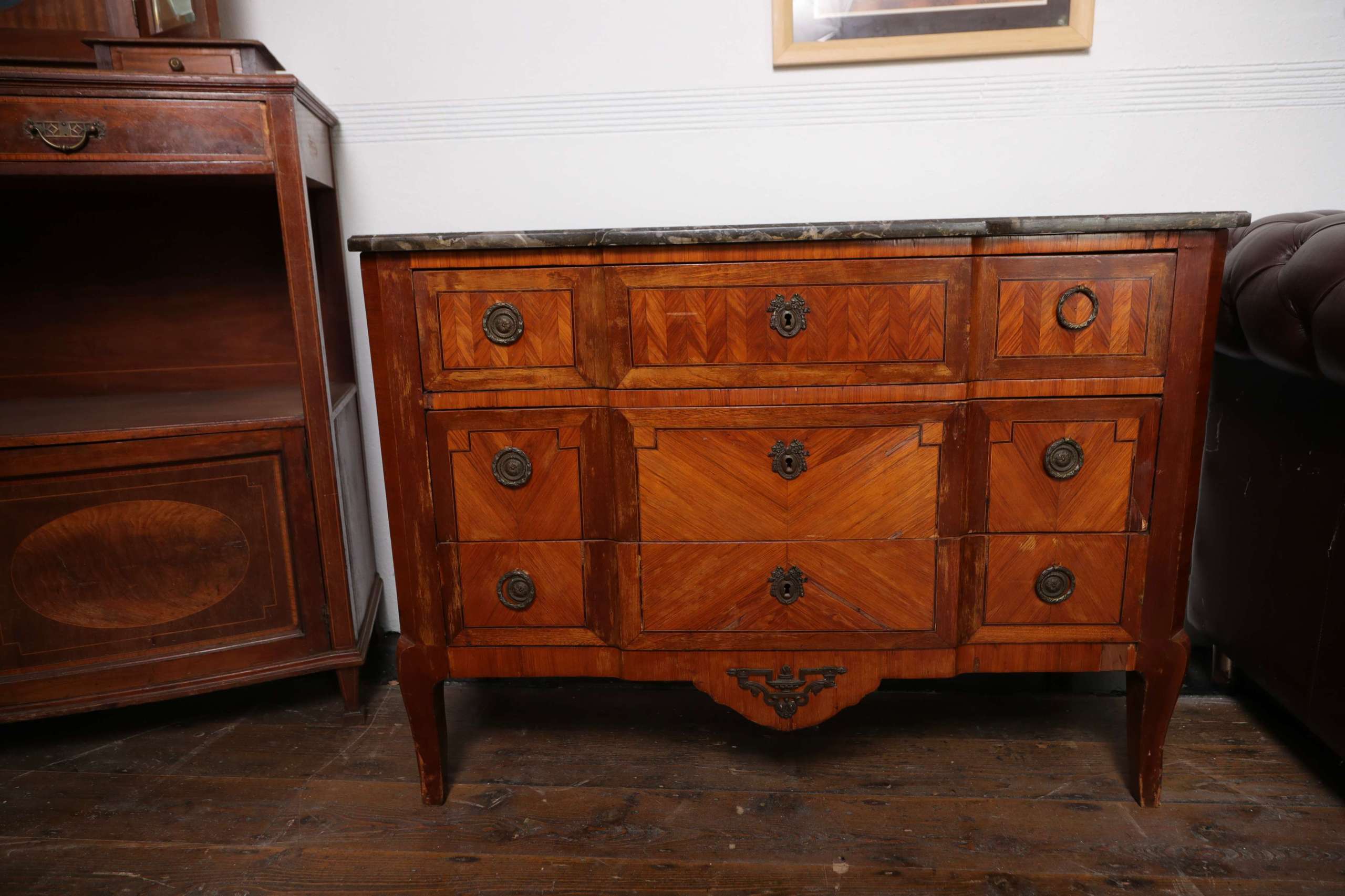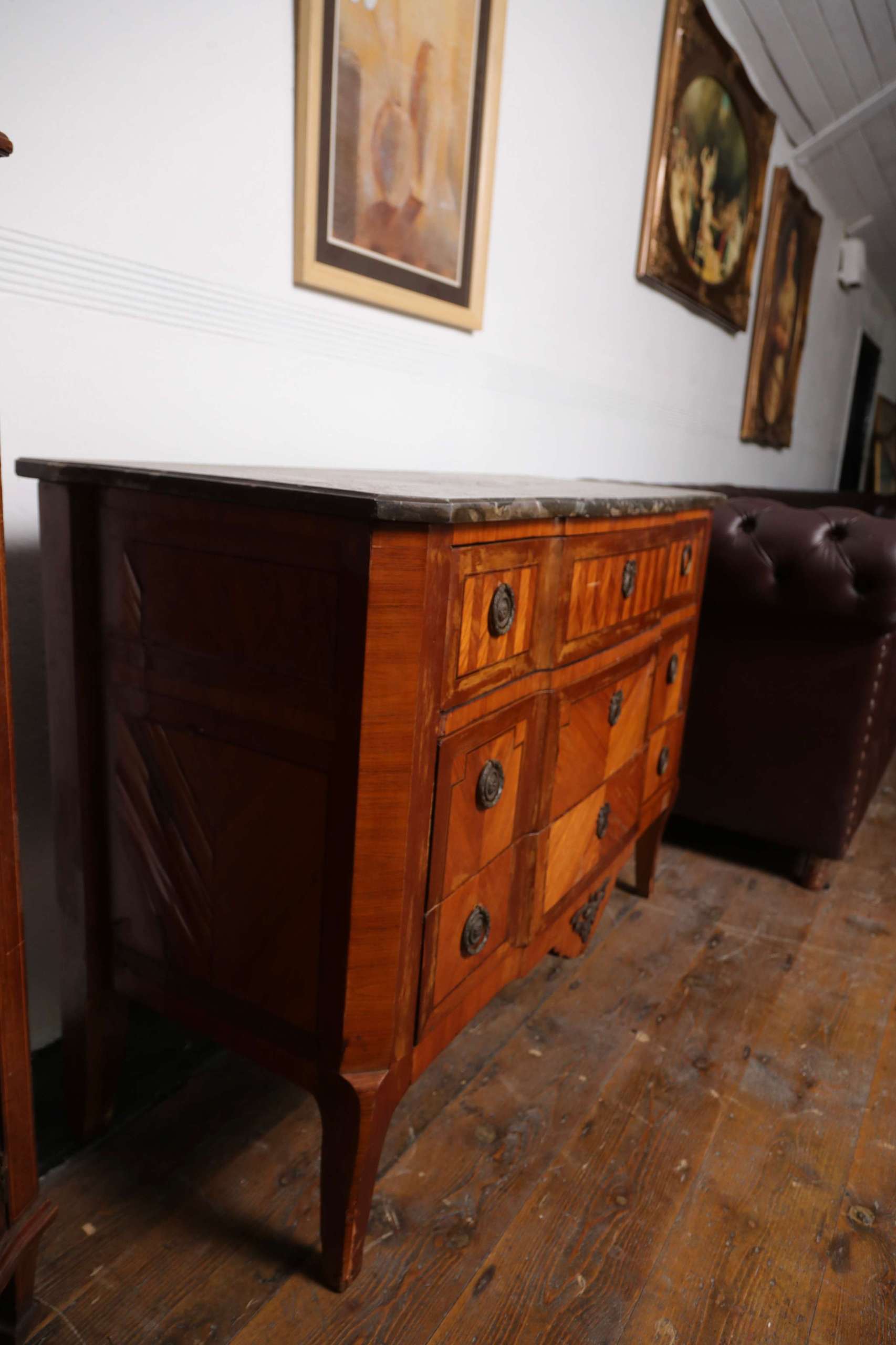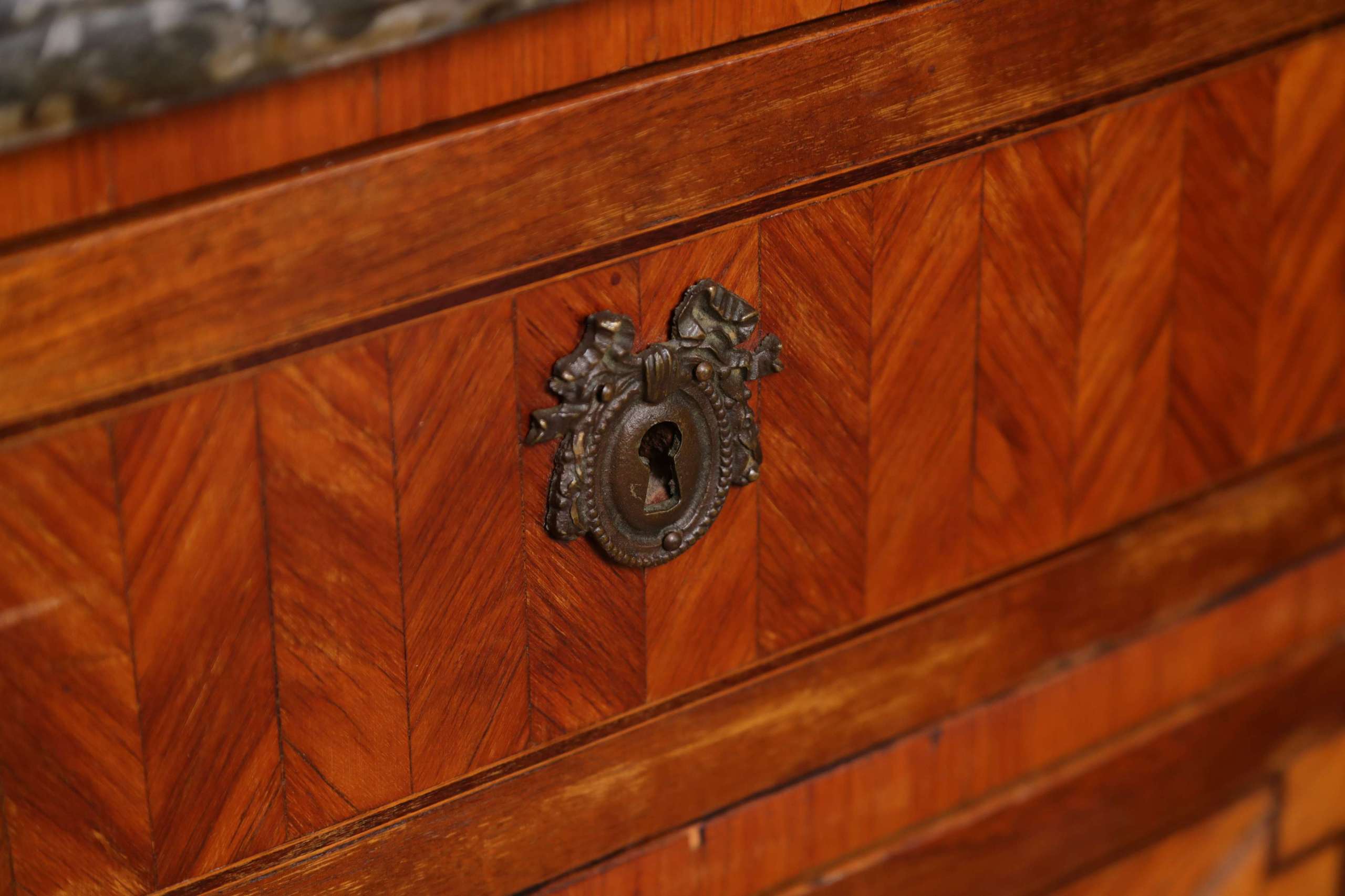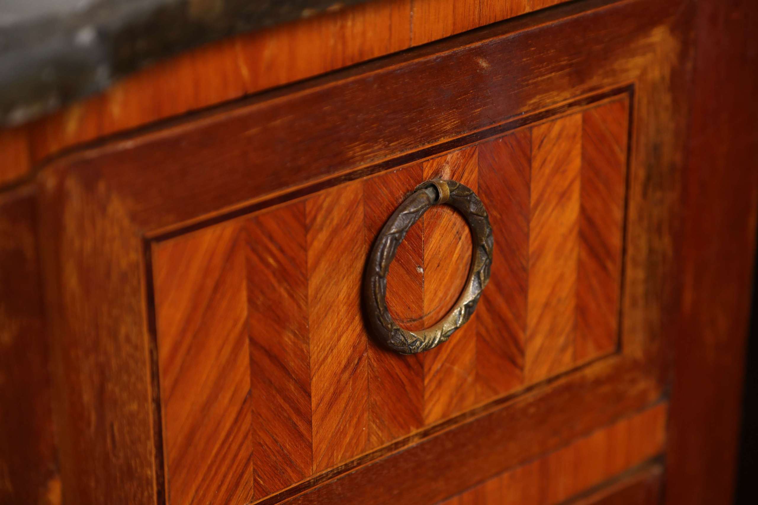 Home / French Antiques / Antique Chest of Drawers & Boxes / Louis XVI Style Marquetry Commode Louis XVI Style Marquetry Commode Elegant 19th-century Louis XVI style chest featuring fine marquetry and a beautifully veined marble top. Original bronze hardware and classic tapered legs complete this refined French piece. Categories: Antique Chest of Drawers & Boxes, French Antiques Product ID: 1447