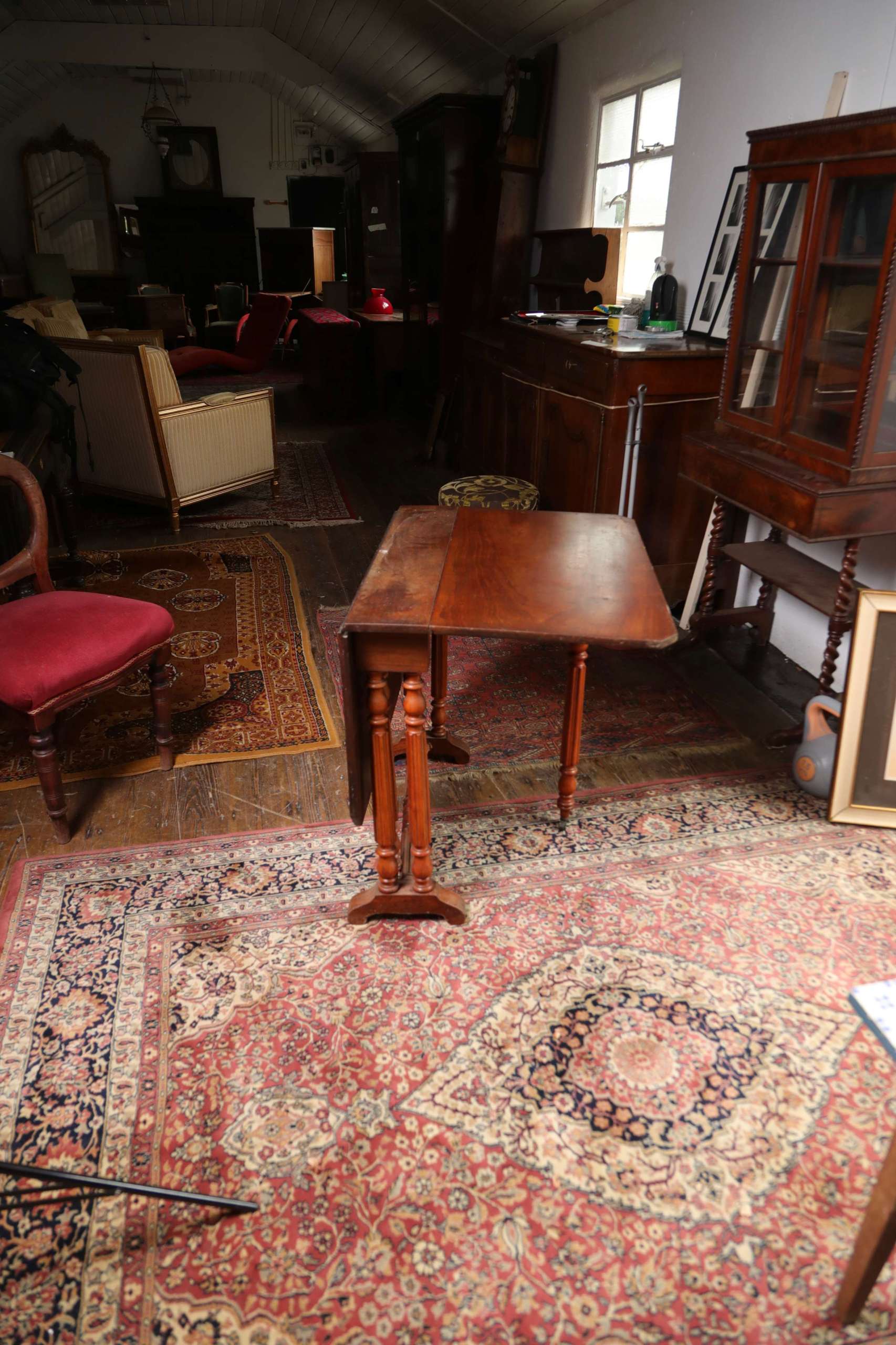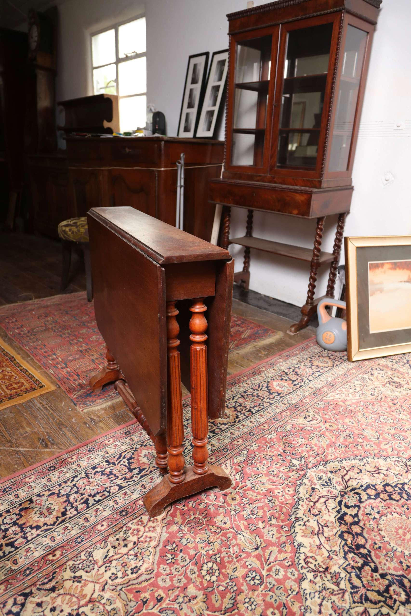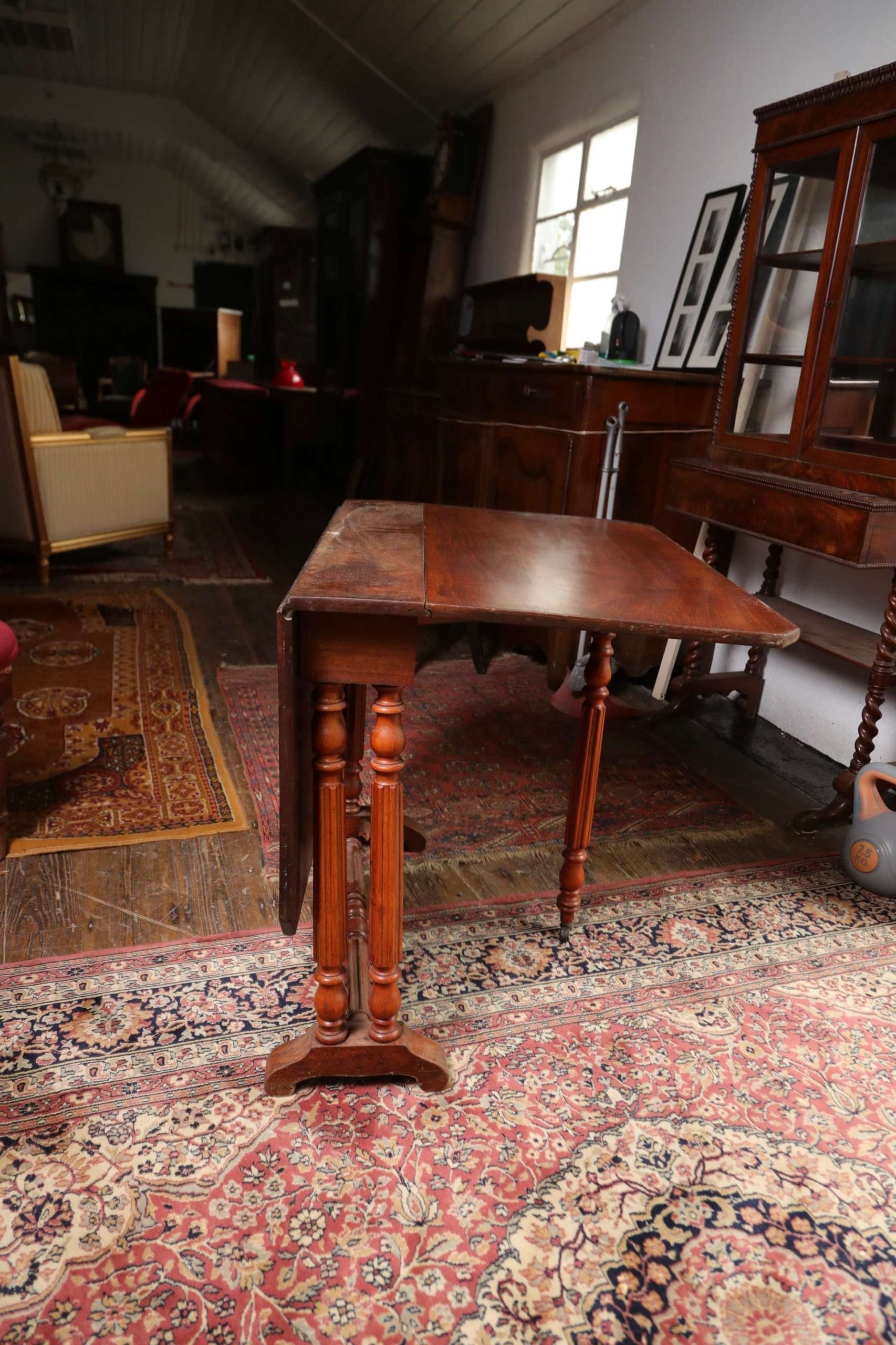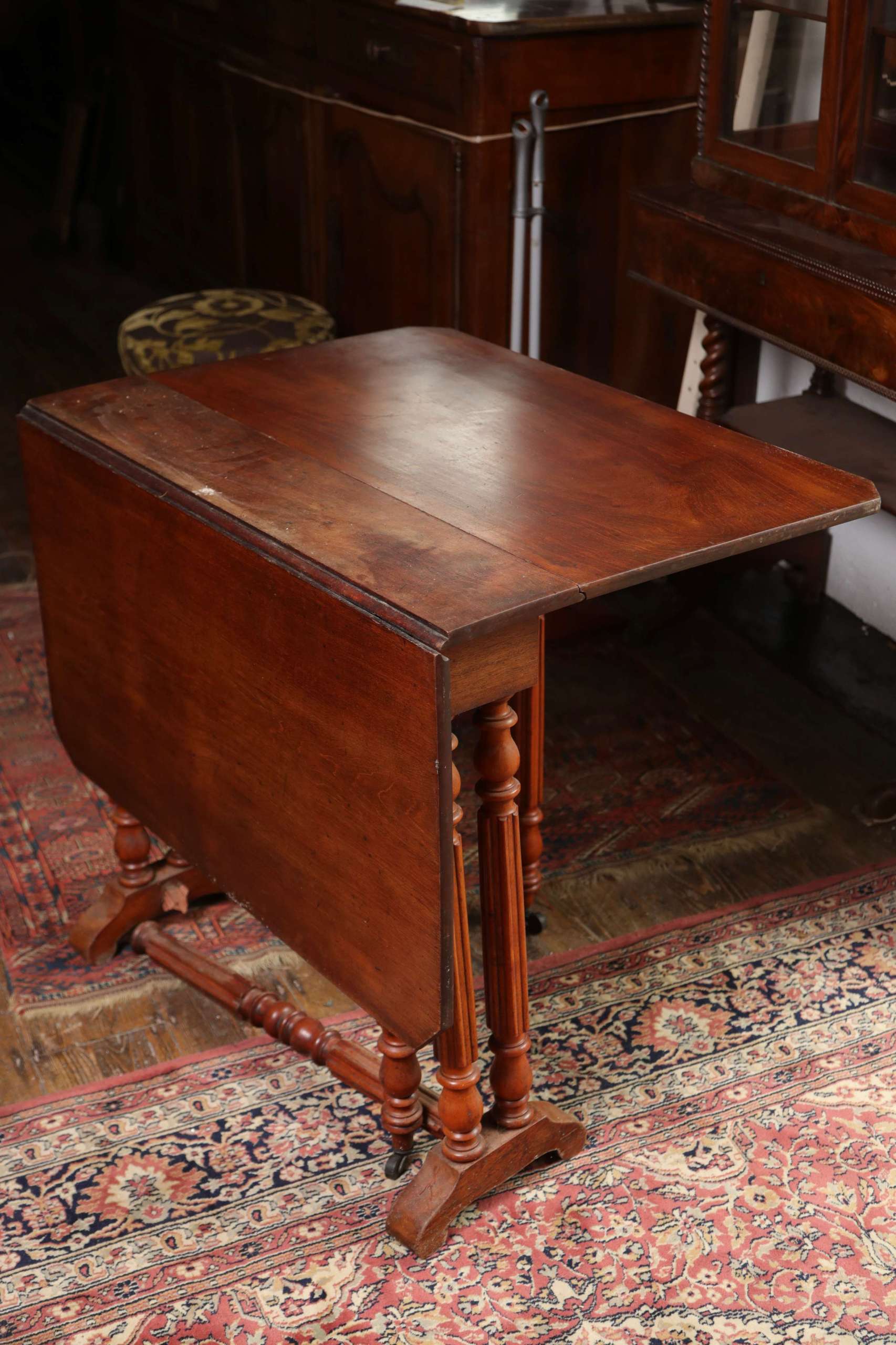 Victorian-era drop-leaf table, commonly referred to as a gateleg table. The sides of the table can be lifted to extend the surface area, and dropped down when not in use—an efficient design from the 17th century onward, popularized again in the Victorian era.