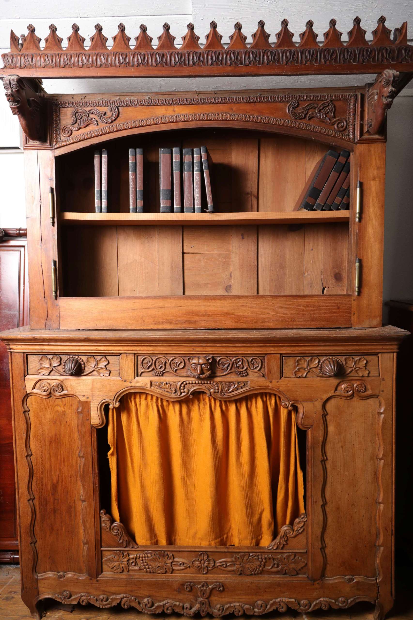 Exquisitely hand-carved Gothic Revival (late 19th Century) cabinet with grotesque faces and rich foliate details. Features upper shelving and a curtained lower compartment for stylish concealed storage.
